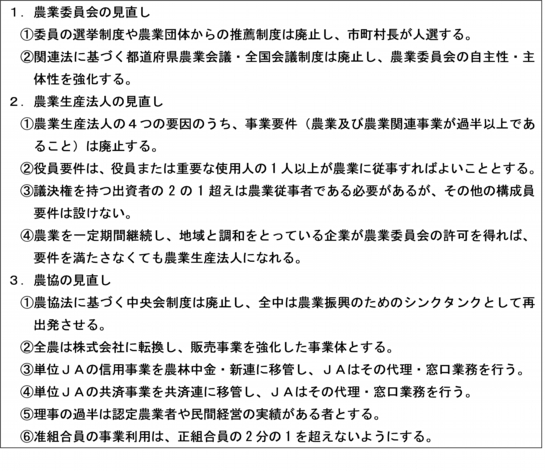 【規制改革会議・農業ワーキンググループからの提案の骨子】